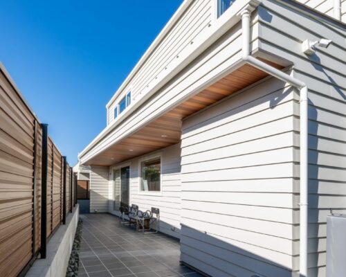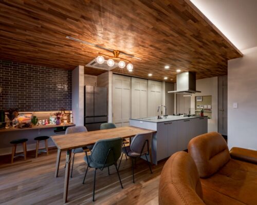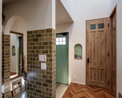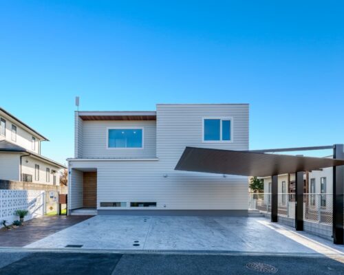 白いラップサイディングが映える西海岸風の外観に、テラスを設けた住まい。家族が集まる開放的なLDKとアイランドキッチンを中心に、水回りは使いやすい動線でまとめました。玄関ホールは吹き抜けとヘリンボーン張りにし、大容量のシューズクローゼットもデザイン性にこだわり、アメリカンハウスの世界観を形にしました。